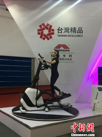 图为台湾精品馆内,模特正在椭圆机上做演示。 乌瑶 摄