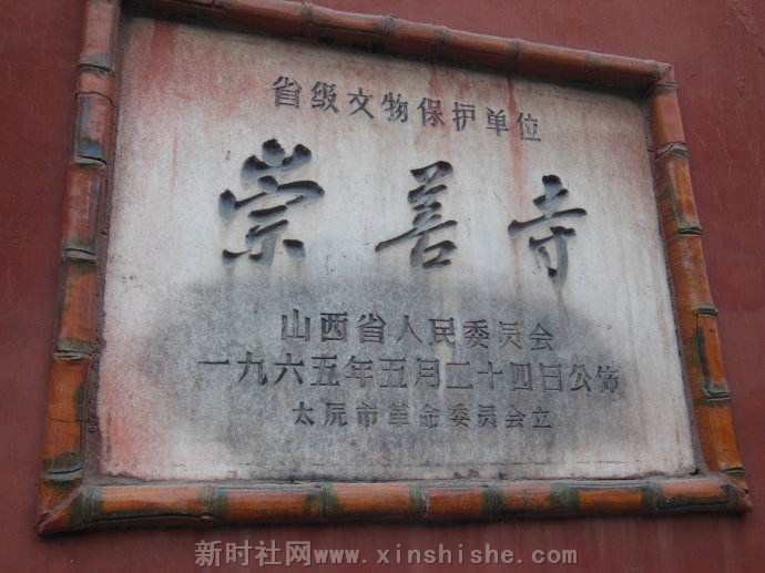 位于太原市东南。始建于唐,初名白马寺,后改延寿寺、宗善寺,明代改称今名。全寺面积约14万平方米,大雄宝殿居中,高30余米,四周殿堂楼阁、亭台廊庑近千间。现存山门、钟楼、东西两厢和大悲殿。崇善寺有三宝,一是大悲殿内供奉千手千眼十一面观音及千钵文殊和普贤三尊巨像,高8.5米。二是宋元明版藏经,是研究佛教史和佛教经义的珍贵文物。三是壁画临摹本。为省级文物保护单位。