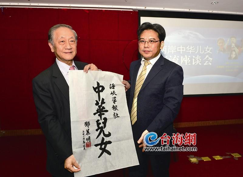 新时社网6月14日讯 (海峡导报记者 林靖东 林连金 薛洋 林静娴 陈成沛 许巧娜/文 吴晓平 梁张磊 常海军/图)在座谈会上简短的启动仪式上,新党主席郁慕明一行与海峡导报还互赠了礼物。郁主席送的是一幅中华儿女题字墨宝,字体刚健挺拔、气度恢弘。