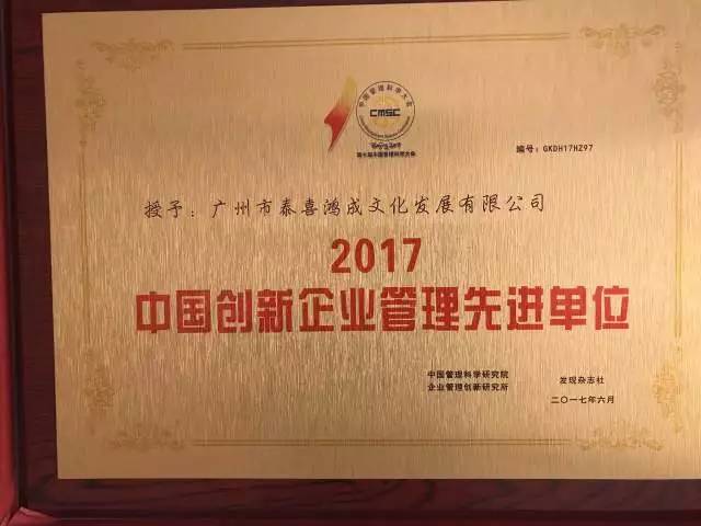 袁莹老师的文化公司—广州市泰喜鸿成文化发展有限公司也被授予《中国创新企业管理先进单位》