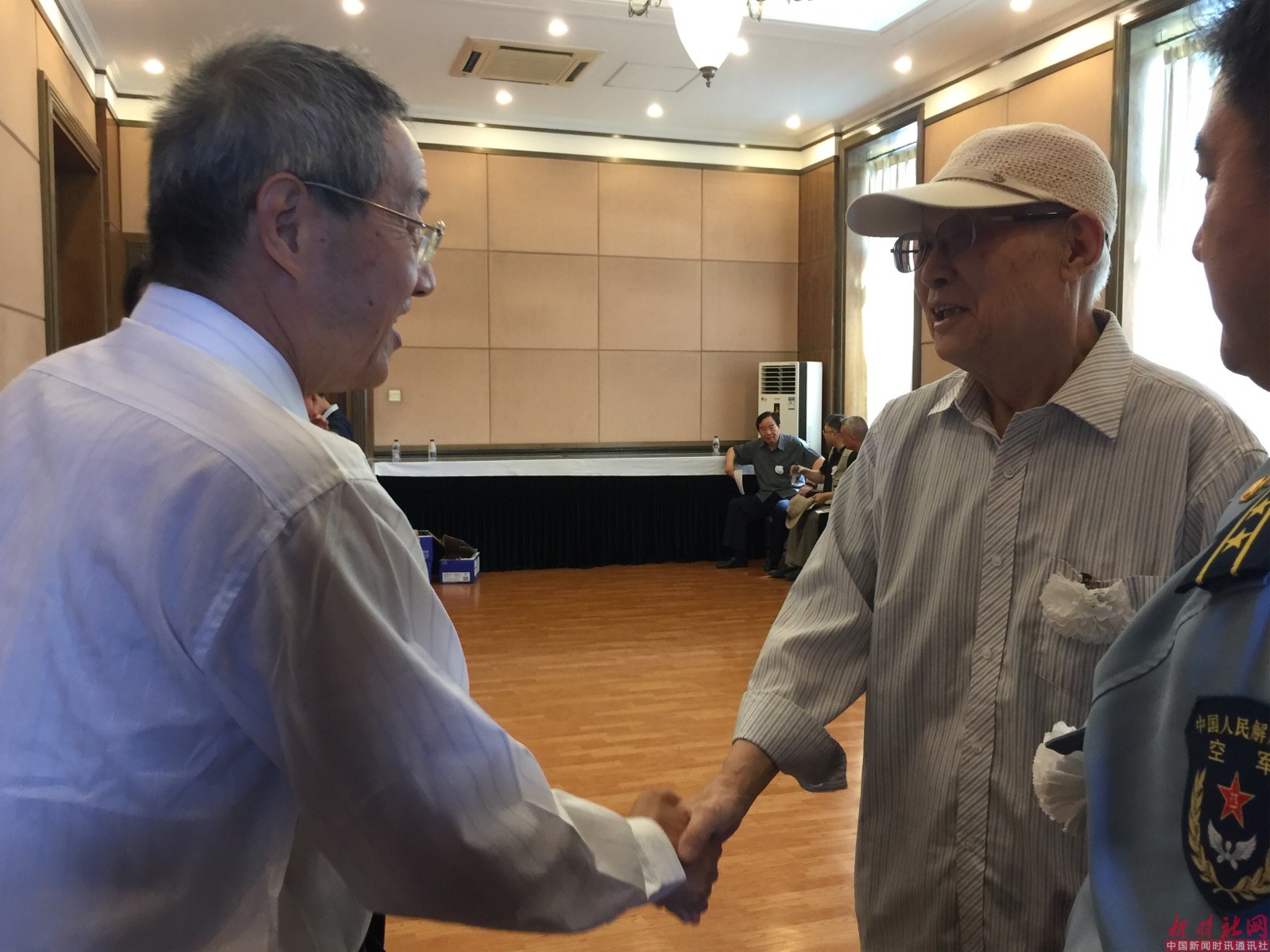 北京新四军研究会副会长兼秘书长乔泰阳将军(中)与朱鸿之子朱宏佐(右)、朱宏佑(左)在现场。