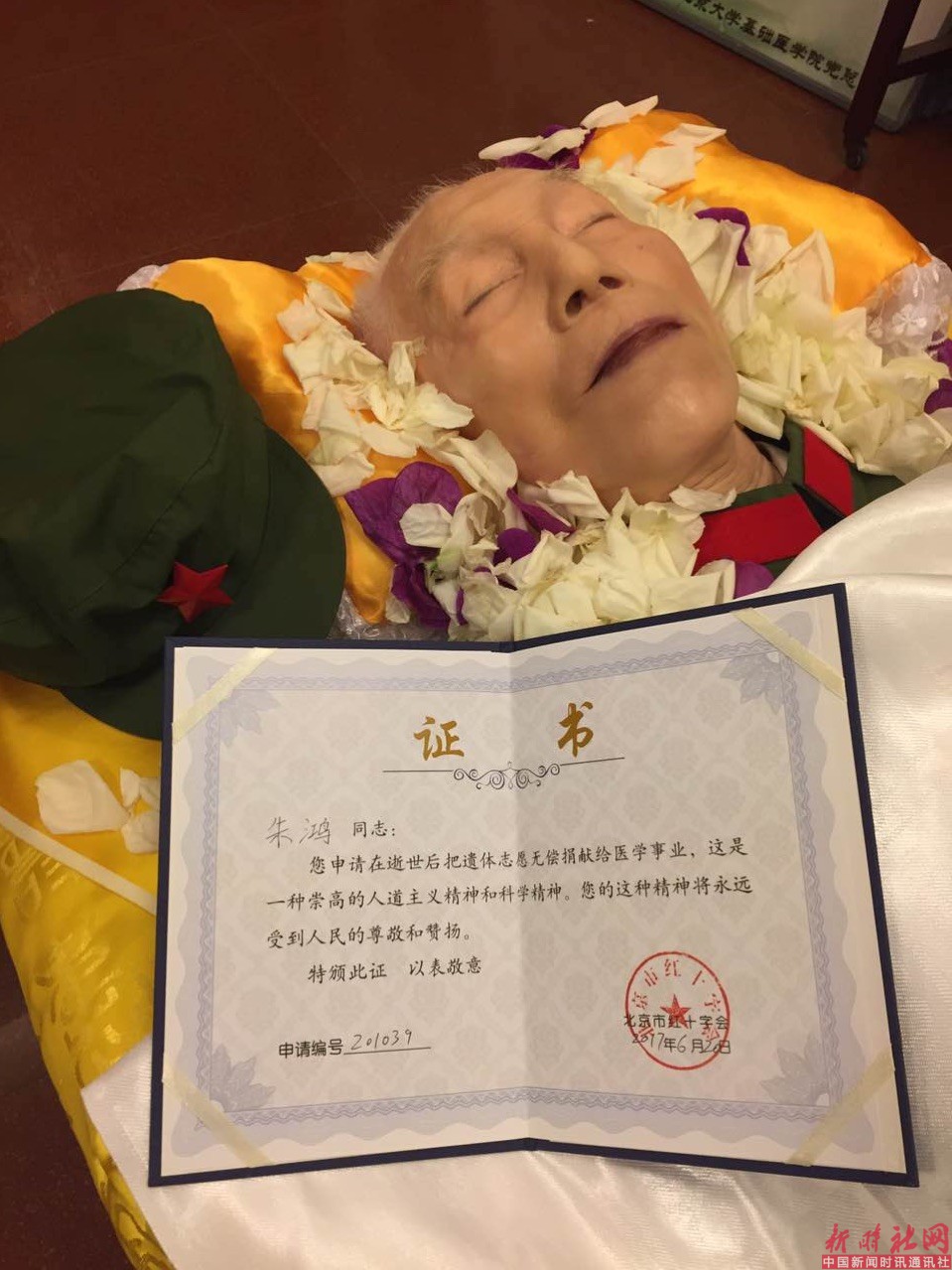 北京2017年6月20日电中国共产党的优秀党员、八路军、新四军老战士,久经考验的忠诚的共产主义者,中国人民解放军空军政治部宣传部第一任部长、空军报社第一任社长,原空政研究员,副军职离休干部朱鸿同志,因病医治无效,于2017年6月14日13时10分在北京逝世,享年100岁。6月20日上午,朱鸿同志的遗体告别仪式在八宝山革命公墓东礼堂举行。朱鸿同志生前写下遗愿,遗体捐赠给祖国医学事业。