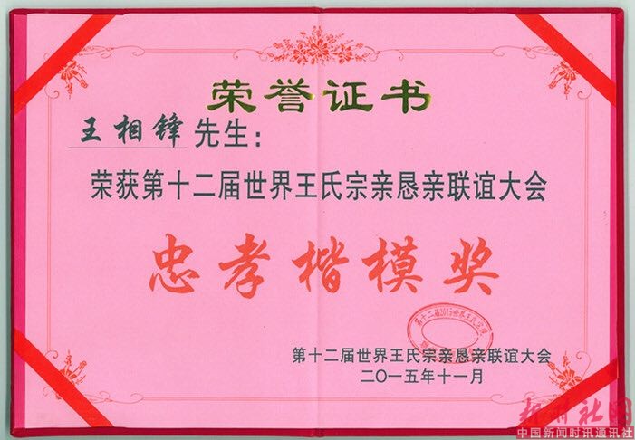 王相锋是中原忠孝十大人物, 退伍军人。2003年12月参军入伍,在部队曾多次立功受奖受到各级领导和战友们的一致好评和肯定,2008年12月退役后在旅行社工作,在工作中认认真真,在生活中替妻子分劳。因为他知道互敬互爱是家庭和谐的基础,更是幸福的源泉。为了家庭,他从来没有抱怨过什么,和邻里之间的相处也很和睦、融洽。同时,他还用实际行动影响着周围的家庭,不仅让家人感到温暖,同时也带动了村里1000余户家庭争创和谐文明家庭的积极性。他理解老人,善待老人,忠孝做人,从而成为大家学习的典范!2012年8月被郑州市文明办、郑州市妇联和郑州晚报社授予“和谐家庭”荣誉称号,2014年8月被中华网、政协评选为“中原忠孝十大人物”。他用实际行动来践行孝道、关照同胞、服务社会,身体力行地呼吁身边人将好家风、好家训传承下去,为建设和谐中原贡献力量。 供稿:师志强、杨延武