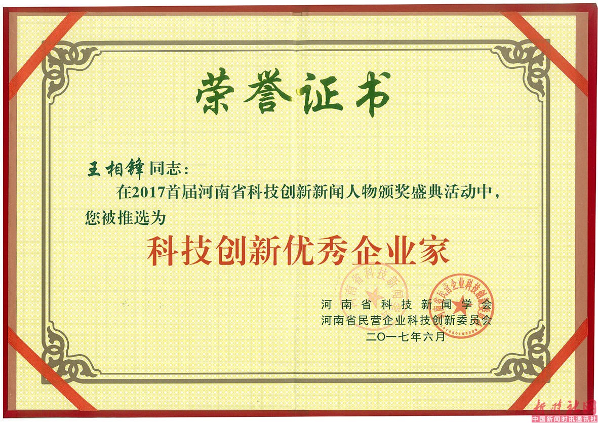 山西站站长杨文阁报道:近日,记者从河南省科技新闻学会获悉,“中原忠孝十大人物”王相锋又添殊荣,被评为“科技创新优秀企业家”。