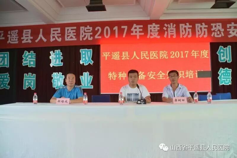 山西站站长杨文阁报道:近日,平遥县人民医院组织召开医院职工安全管理培训大会,邀请平遥县消防大队、平遥县南城派出所、晋中市特种设备检验所相关负责同志进行专题培训及实地检查。平遥县卫计局局长、平遥县人民医院院长张增贵同志就安全管理的重要性与安全知识培训及实战演练的必要性做重要指示。本院职工共计200余人参加培训。会议由郝培成副院长主持。