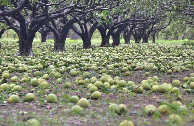 尼伯特台风过境,农作落果、折枝或倒伏严重,台东县政府评估农损达新台币6亿元。图为文旦遍地落果。 (图片来源:台湾中央社)