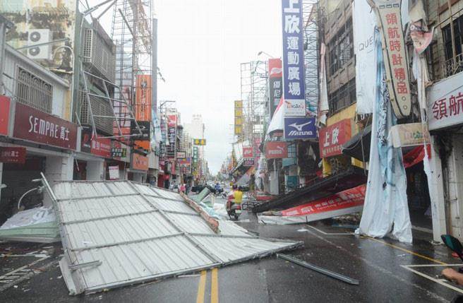 台东市闹区招牌掉落一地,行车要到处闪躲就像挑战障碍赛。(图片来源:台湾《中时电子报》)