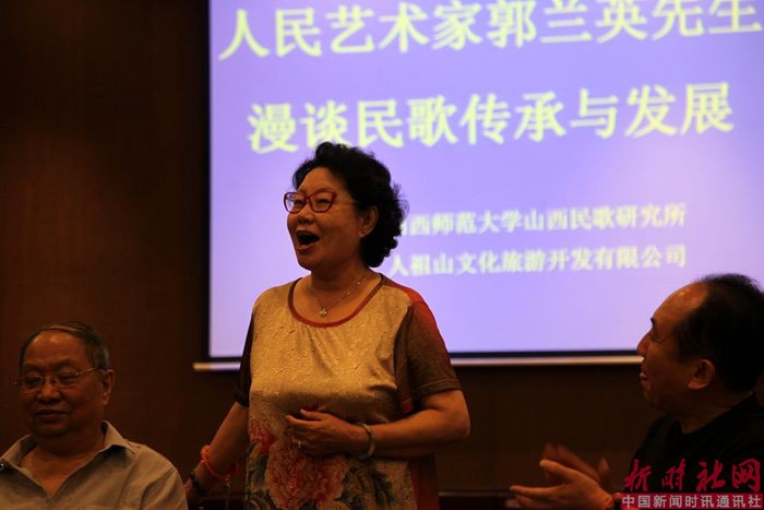 8月11日晚8点30分,人民艺术家郭兰英先生亮相人祖山,对参加“人祖山杯”晋陕蒙民歌大赛决赛的选手鼓劲加油。晚9点在人祖山忘忧山庄会议室与民歌界各位学者参加民歌传承与发展的座谈会。