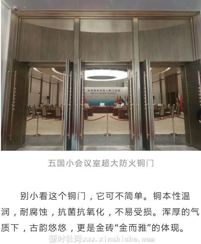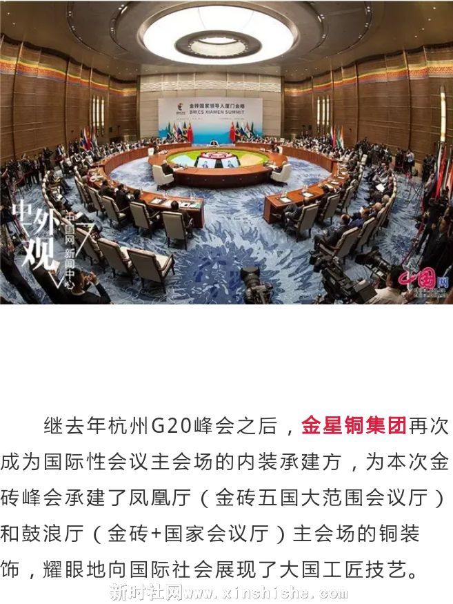 继去年杭州G20峰会之后,金星铜集团再次成为国际性会议主会场的内装承建方,为本次金砖峰会承建了凤凰厅(金砖五国大范围会议厅)和鼓浪厅(金砖+国家会议厅)主会场的铜装饰,耀眼地向国际社会展现了大国工匠技艺。
