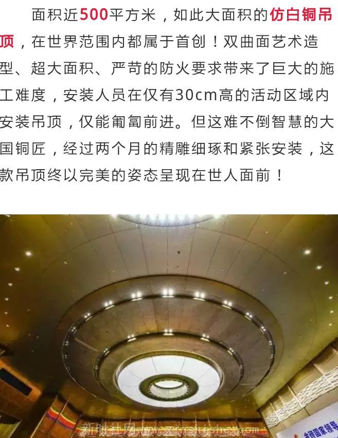面积近500平方米,如此大面积的仿白铜吊顶,在世界范围内都属于首创!双曲面艺术造型、超大面积、严苛的防火要求带来了巨大的施工难度,安装人员在仅有30cm高的活动区域内安装吊顶,仅能匍匐前进。但这难不倒智慧的大国铜匠,经过两个月的精雕细琢和紧张安装,这款吊顶终以完美的姿态呈现在世人面前!