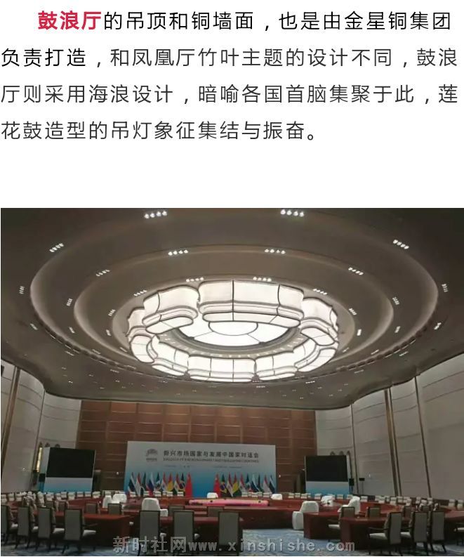 鼓浪厅的吊顶和铜墙面,也是由金星铜集团负责打造,和凤凰厅竹叶主题的设计不同,鼓浪厅则采用海浪设计,暗喻各国首脑集聚于此,莲花鼓造型的吊灯象征集结与振奋。