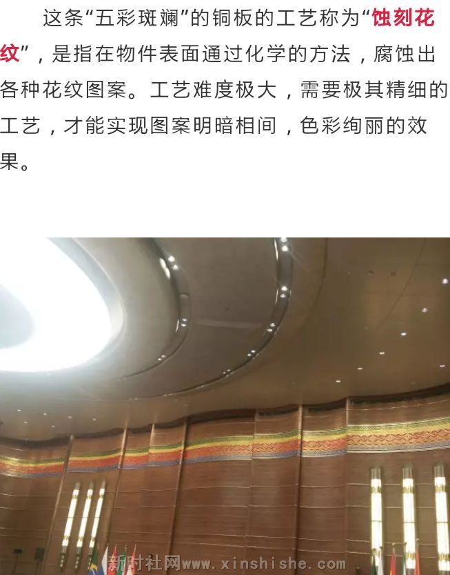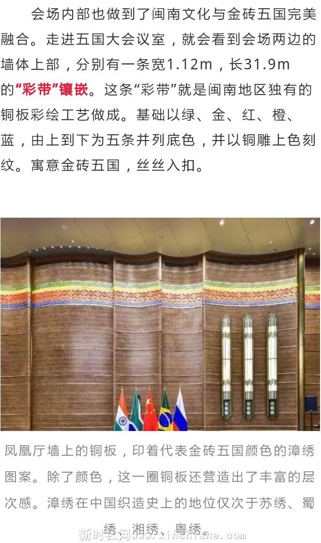 会场内部也做到了闽南文化与金砖五国完美融合。走进五国大会议室,就会看到会场两边的墙体上部,分别有一条宽1.12m,长31.9m的“彩带”镶嵌。这条“彩带”就是闽南地区独有的铜板彩绘工艺做成。基础以绿、金、红、橙、蓝,由上到下为五条并列底色,并以铜雕上色刻纹。寓意金砖五国,丝丝入扣。