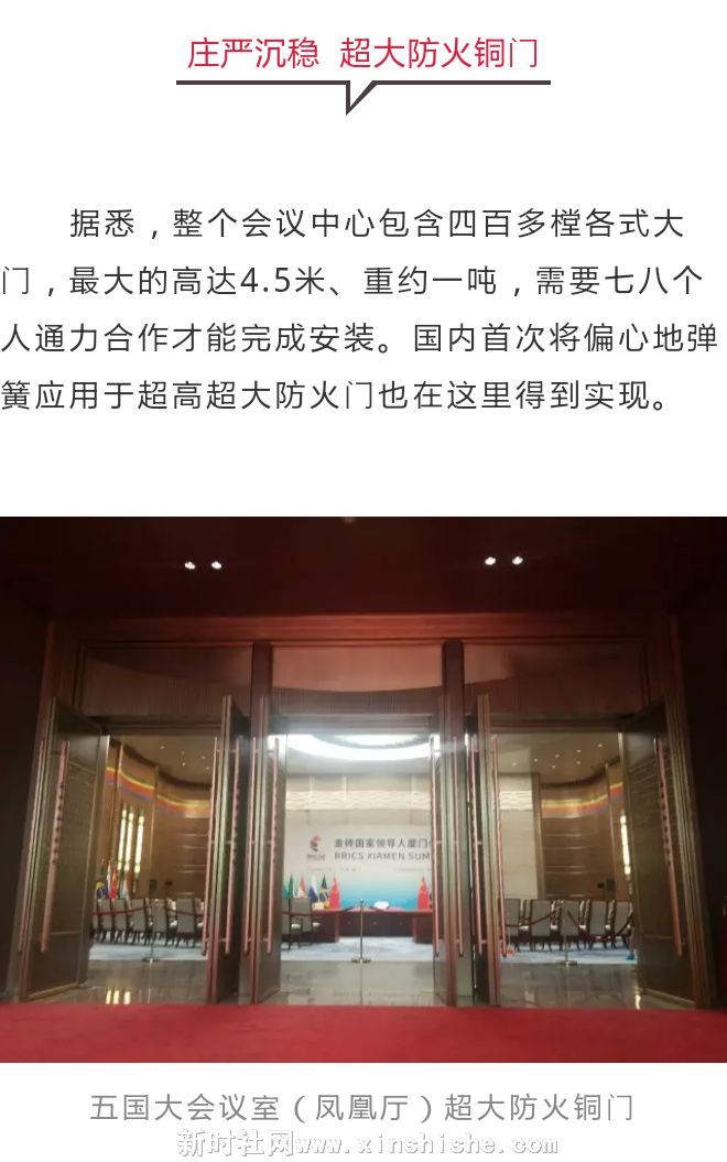 据悉,整个会议中心包含四百多樘各式大门,最大的高达4.5米、重约一吨,需要七八个人通力合作才能完成安装。国内首次将偏心地弹簧应用于超高超大防火门也在这里得到实现。