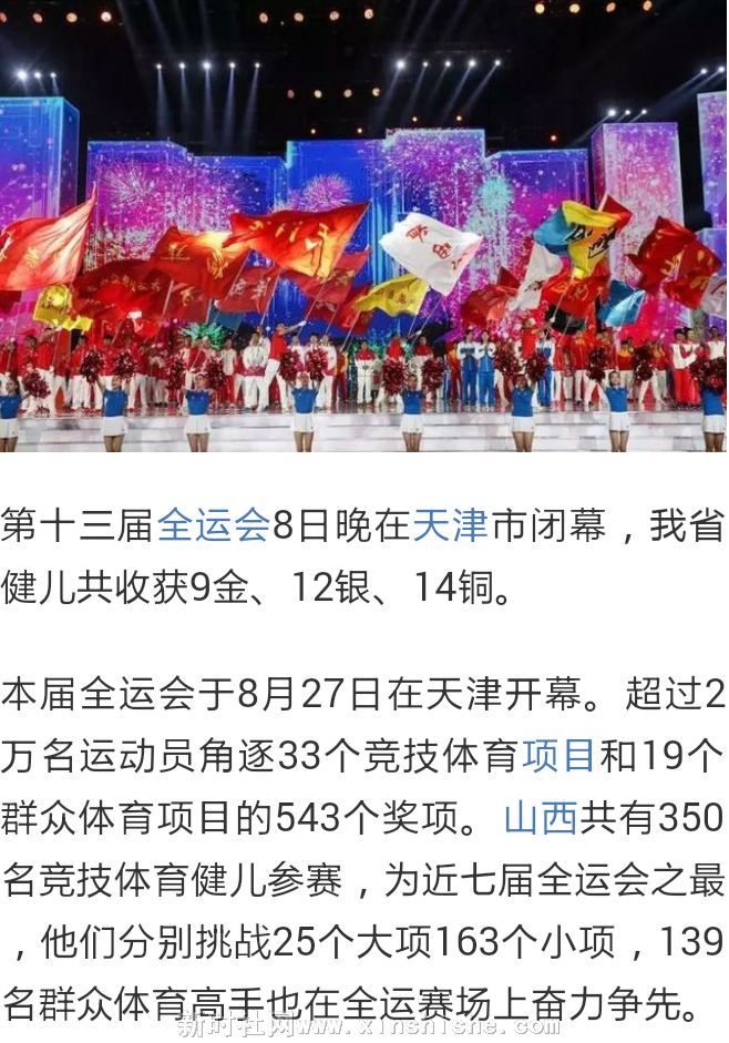 第十三届全运会9月8日晚在天津市闭幕 山西省健儿共收获9金12银14铜