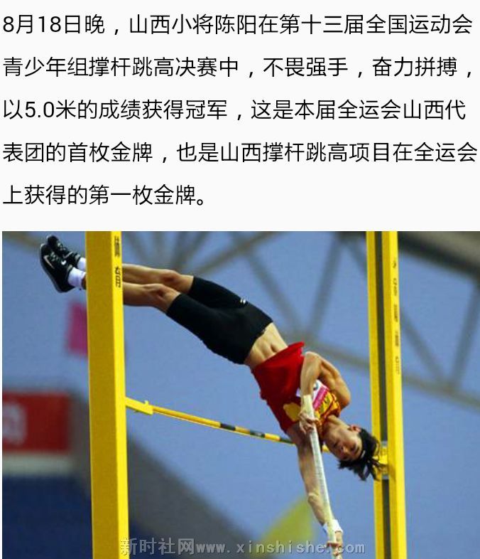 8月18日晚,山西小将陈阳在第十三届全国运动会青少年组撑杆跳高决赛中,不畏强手,奋力拼搏,以5.0米的成绩获得冠军,这是本届全运会山西代表团的首枚金牌,也是山西撑杆跳高项目在全运会上获得的第一枚金牌。