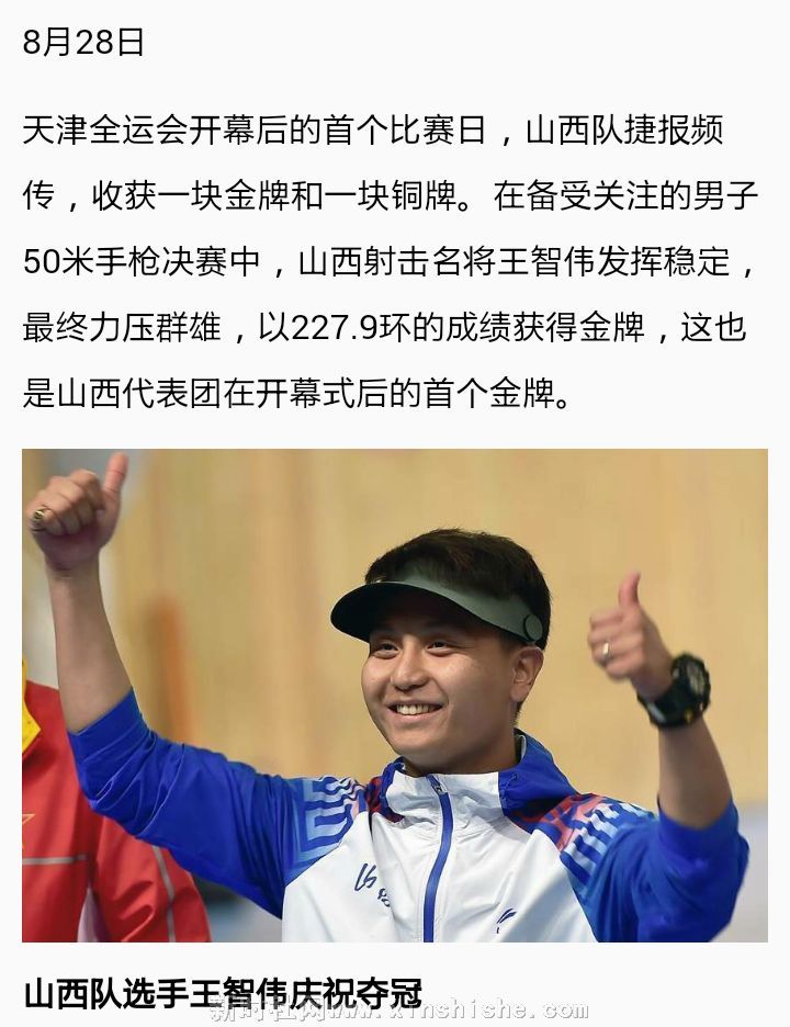 天津全运会开幕后的首个比赛日,山西队捷报频传,收获一块金牌和一块铜牌。在备受关注的男子50米手枪决赛中,山西射击名将王智伟发挥稳定,最终力压群雄,以227.9环的成绩获得金牌,这也是山西代表团在开幕式后的首个金牌。