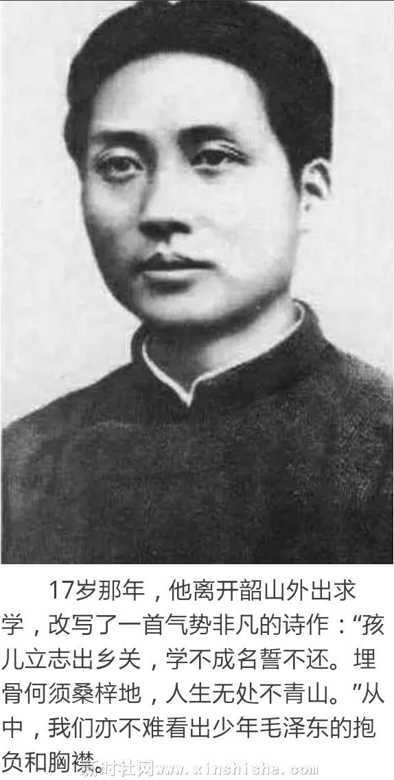 17岁那年,他离开韶山外出求学,改写了一首气势非凡的诗作:“孩儿立志出乡关,学不成名誓不还。埋骨何须桑梓地,人生无处不青山。”从中,我们亦不难看出少年毛泽东的抱负和胸襟。