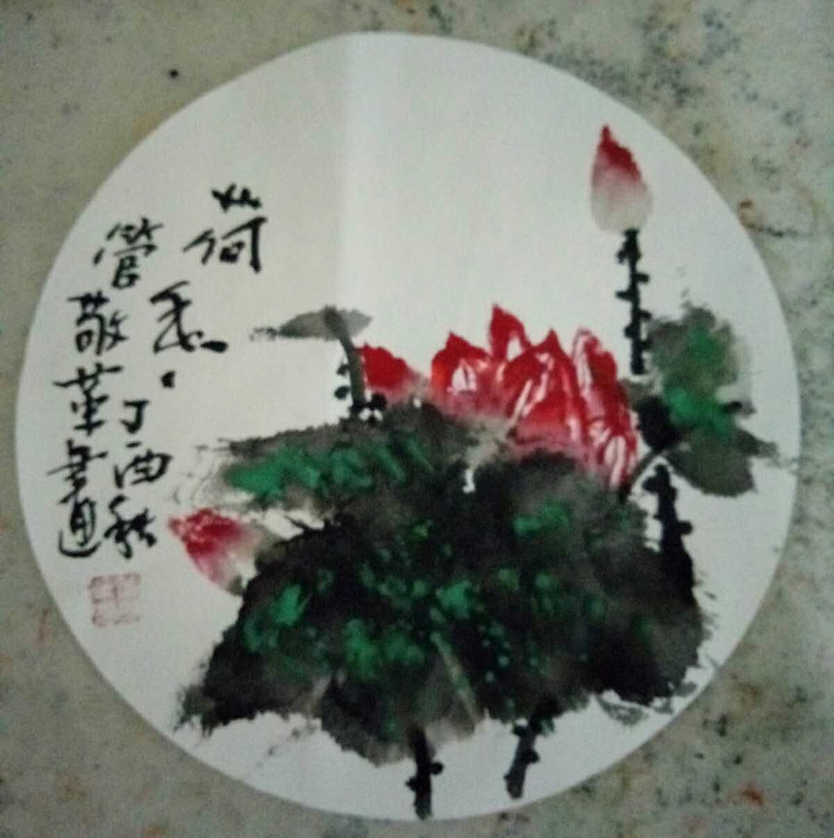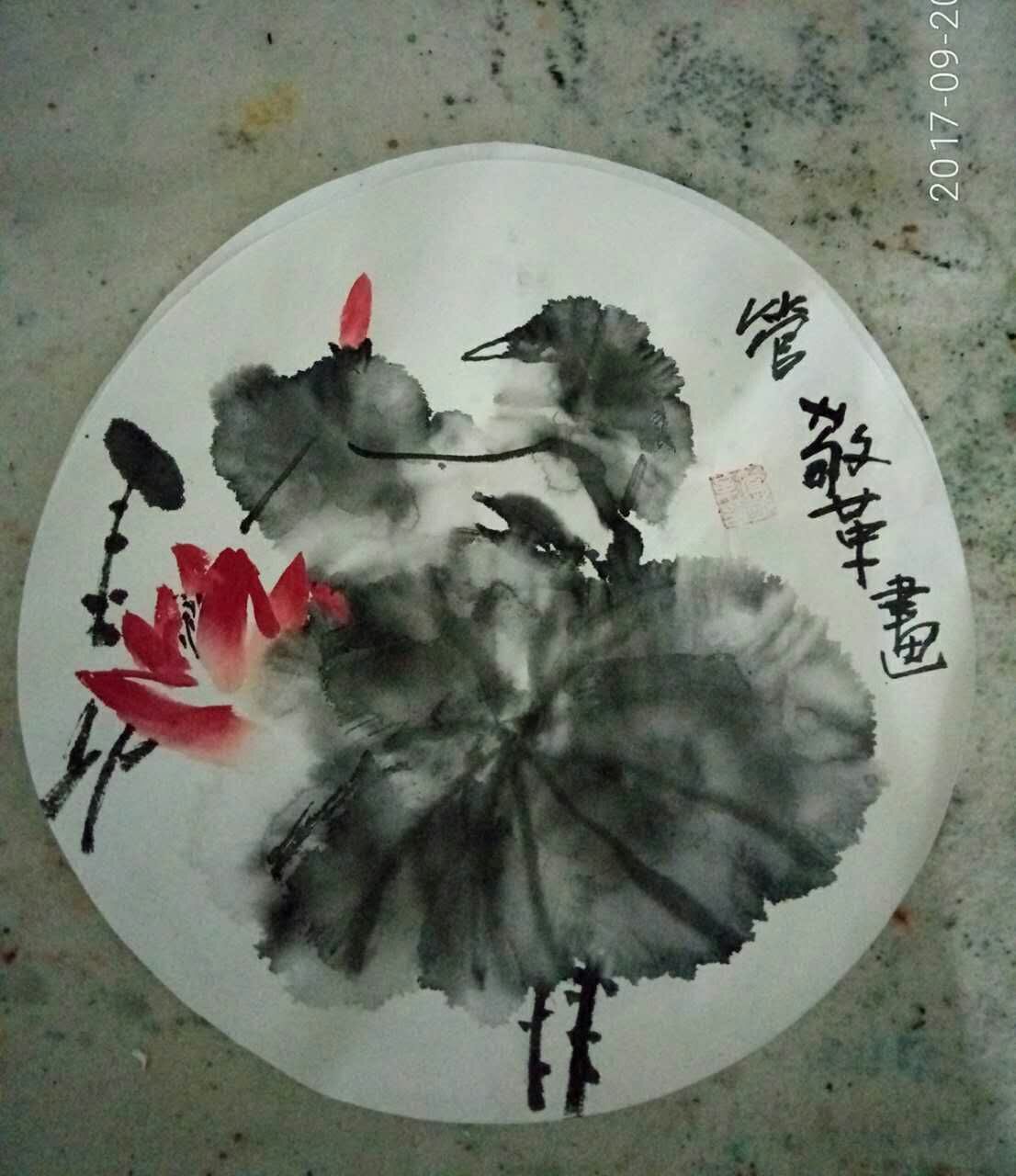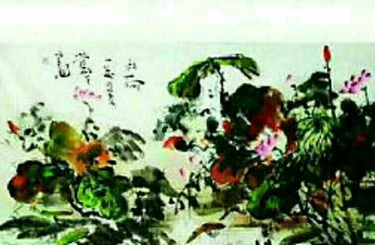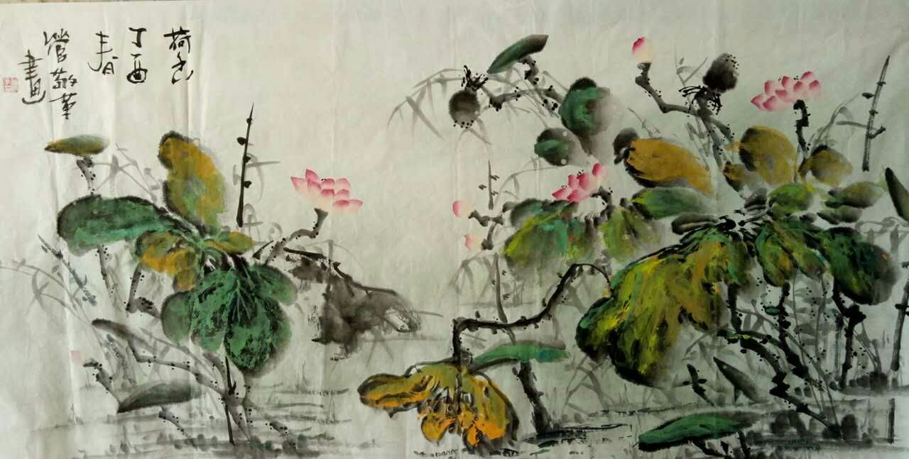 长城脚下荷芳塘,塘里荷花惊四方。四方骚人写荷香,荷香袅袅憾龙王。龙王圣驾迎荷娘,荷娘翩跹舞霓裳,霓裳舞曲妃然笑,笑面春风正梳妆。管敬革常研习张大千之画风,为研究张大千泼墨泼彩荷花,与其后代及大千传人都结成好友,认真研究,请教泼墨泼彩荷花,并加以变化,形成自己一独特画风。