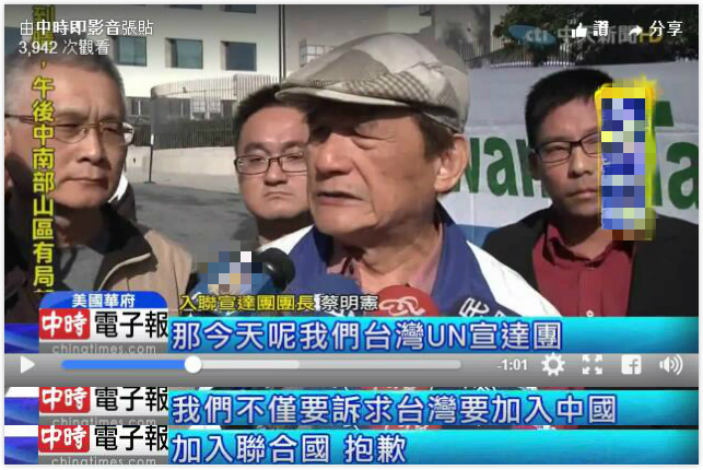 据台湾《中时电子报》报道,15日上午,20多名台湾入联宣达团成员在美国街头持台独标语,叫嚣入联。但有趣的是,团长蔡明宪在接受访问时,把加入联合国讲成了加入中国。这一幕采访视频也被台湾媒体直播,引发网络热议。