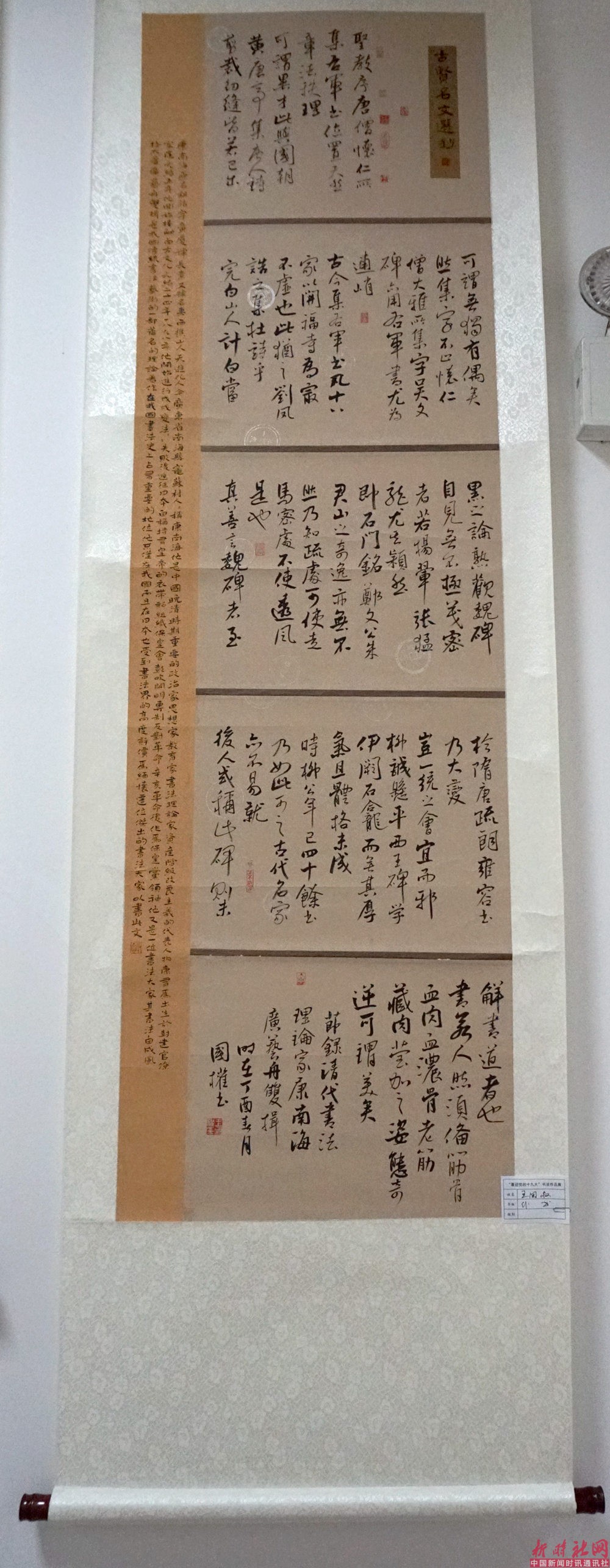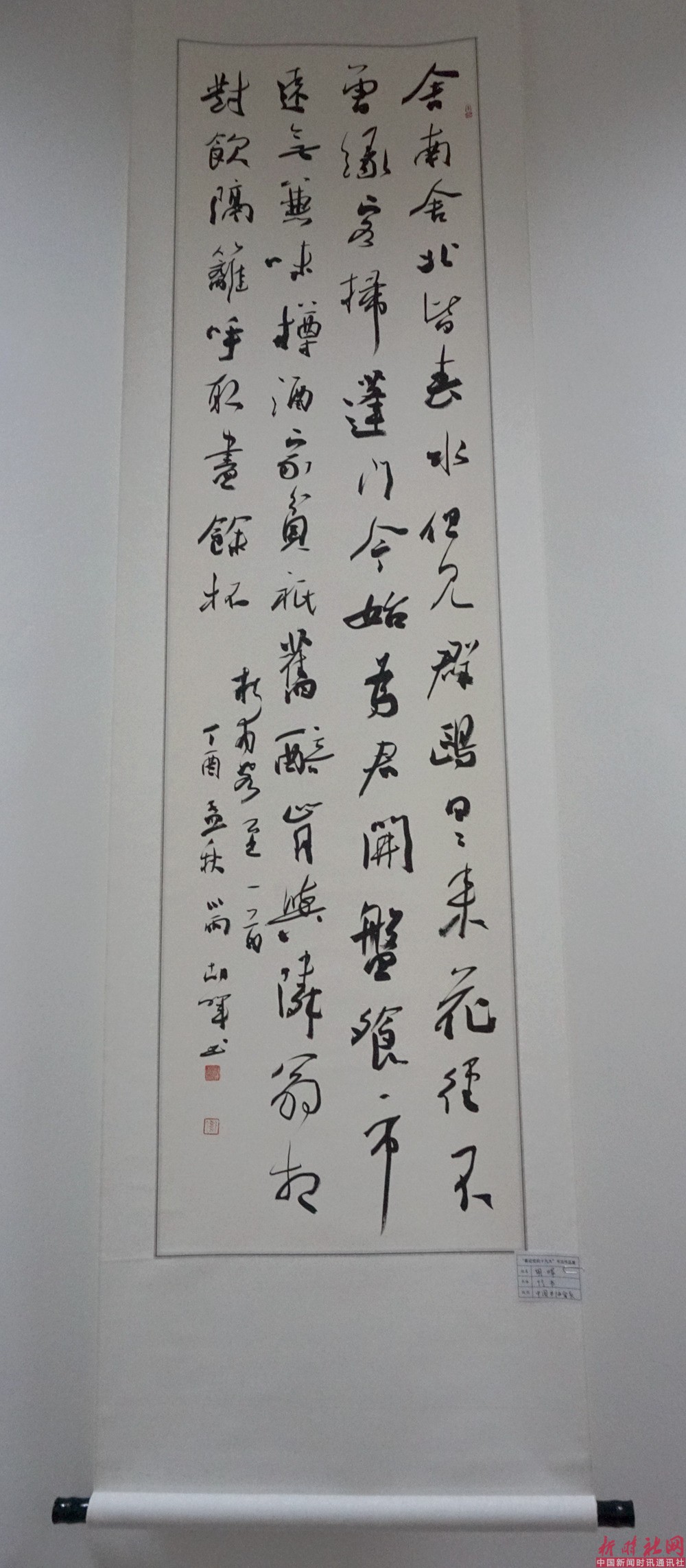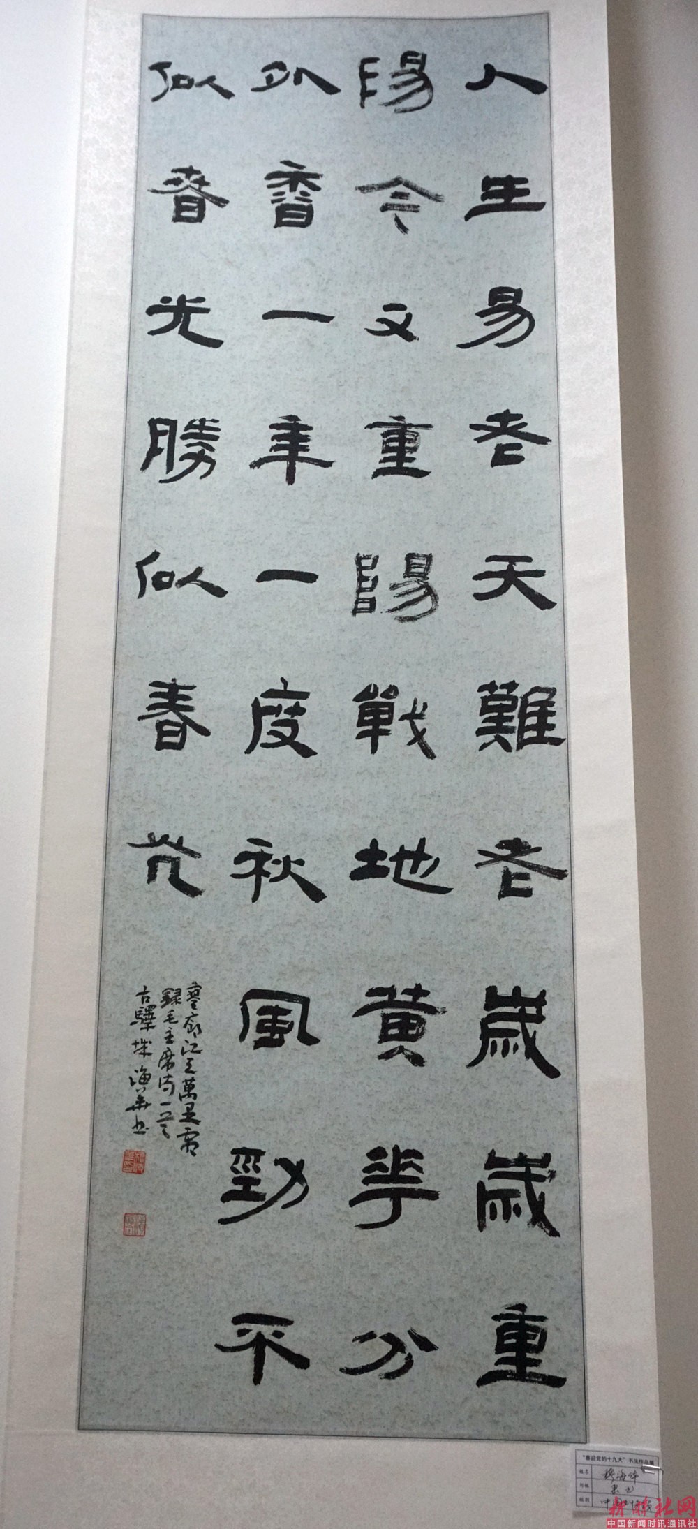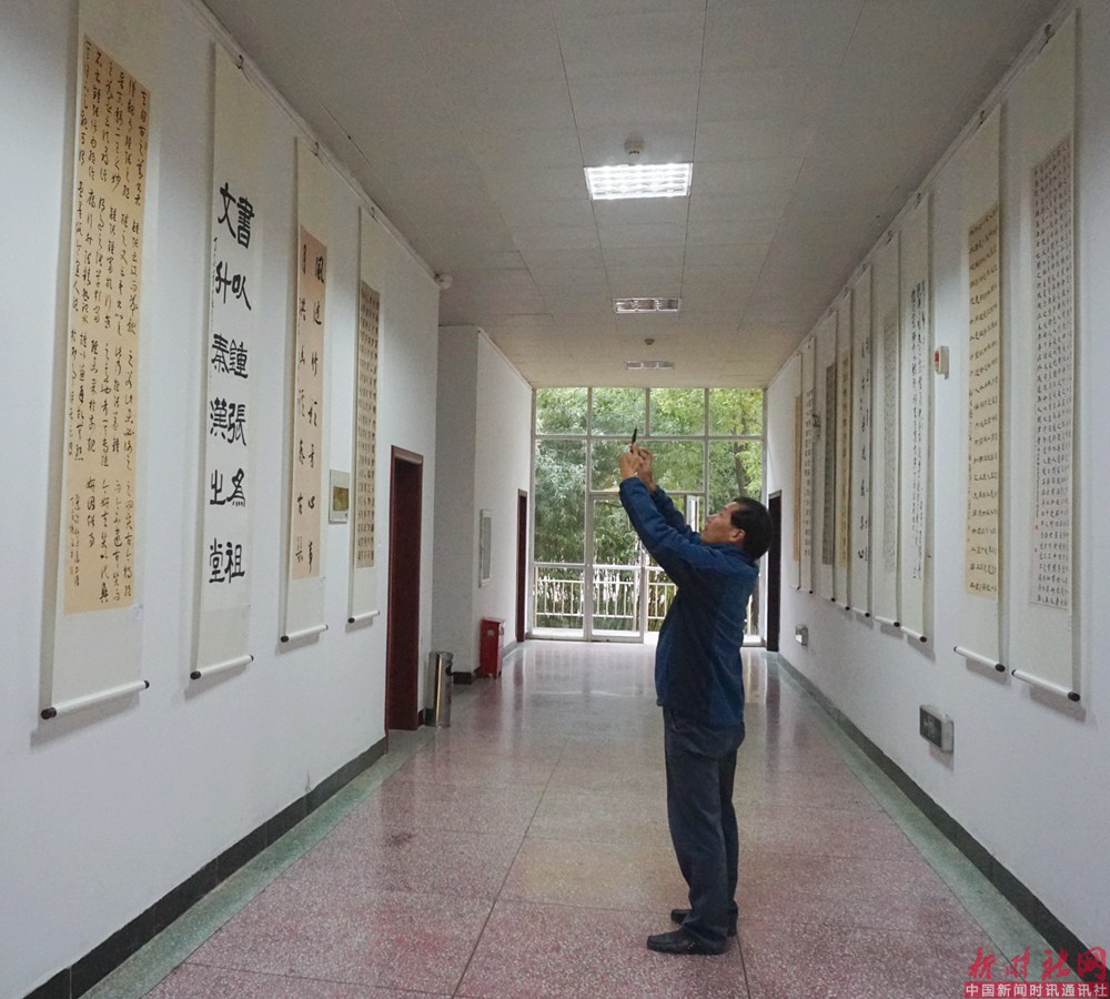 驻马店市书法家协会副主席、驿城区书法家协会主席胡晖同志为此次展出操碎了心,策划运筹,东奔西跑,把展览组织得有条不紊。他说:为了迎接党的十九大召开,就是不吃不睡,也要把展览办好!如此忙碌之余,为了起好模范带头作用,亲自挥毫创作出一幅精美佳作参展,精神可嘉。驿城区委宣传部的米山副部长以组织此次大展为己任,任劳任怨奔波在第一线,哪儿忙哪儿都能看到他的身影,直至布展完备。