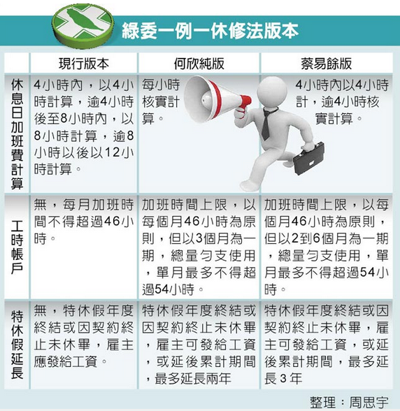 绿委一例一休修正版本。图片来源:台湾《中时电子报》