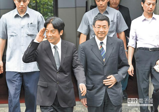 台行政院长赖清德(左)与秘书长卓荣泰(右)等人14日出席行政院会后记者会,面对媒体询问关于一例一休,赖表示会听取各界意见后审慎决定。(张铠乙摄)图片来源:台湾《中时电子报》
