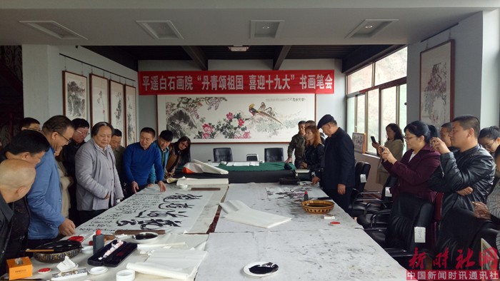 山西站站长杨文阁报道:2017年10月15日,平遥白石画院举行了“丹青颂祖国 喜迎十九大”书画笔会, 平遥县文联赵永平主席亲临指导。毛泽东特型演员、国家一级美术师.著名艺术家李夫晨教授一行7人为活动助兴。