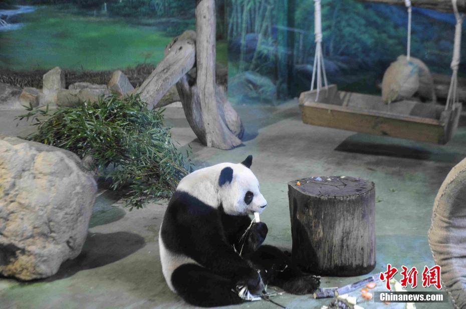 8月29日,是自大陆来台已经9年的大熊猫团团和圆圆13岁生日。台北市动物园当天为夫妻俩举行生日派对,庆祝他们的13岁生日。图为圆圆吃甘蔗。中新社记者 蒋雪林 摄