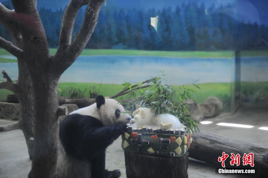 8月29日,是自大陆来台已经9年的大熊猫团团和圆圆13岁生日。台北市动物园当天为夫妻俩举行生日派对,庆祝他们的13岁生日。图为团团秀气的吃相。中新社记者 蒋雪林 摄