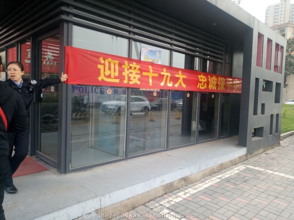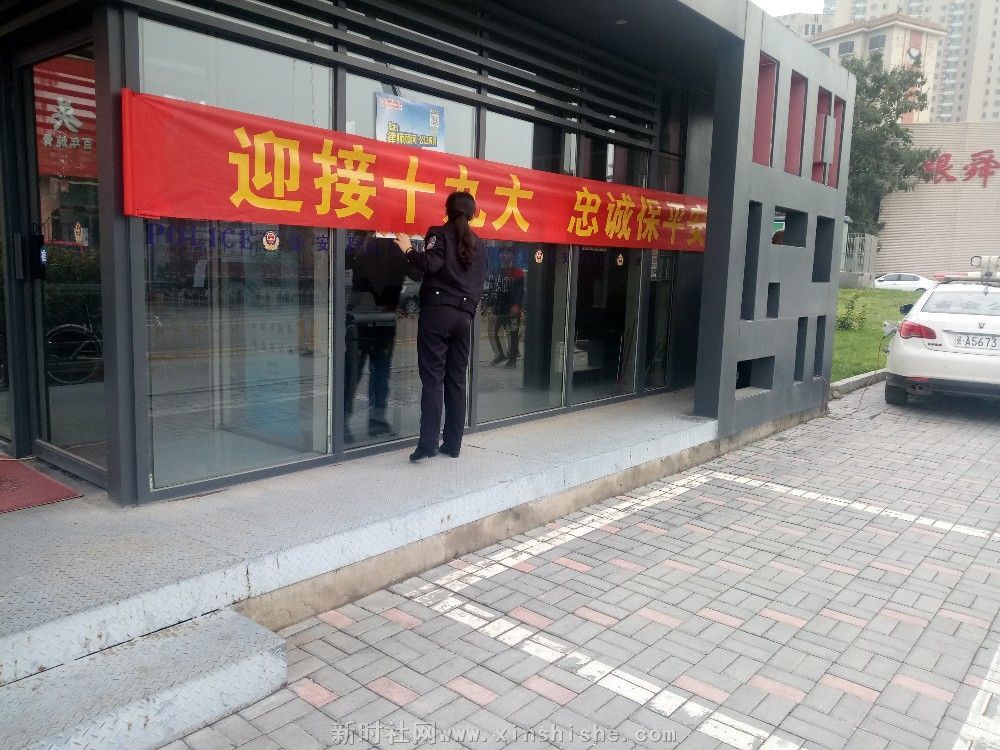 中国共产党第十九次全国代表大会召开在即,各警务站都是有条不紊的部署安检工作。这是某警务站在张贴标语。迎接大会的胜利召开。