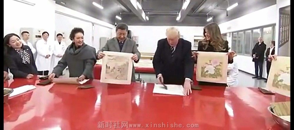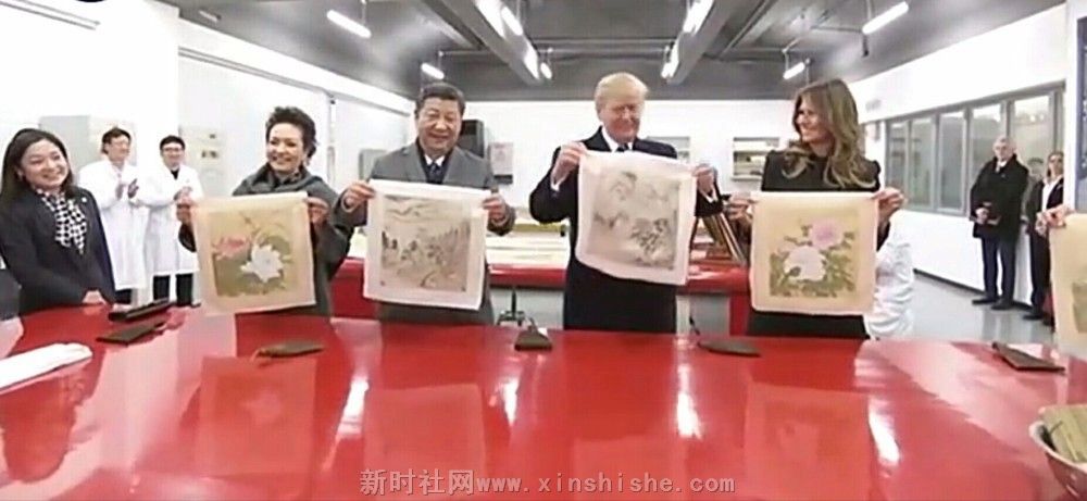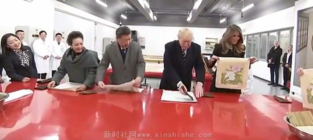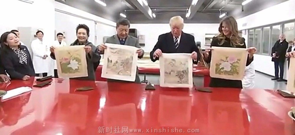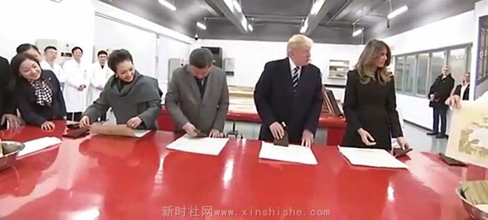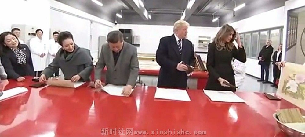 两国元首夫妇先后观赏了钟表、木器、金属器、陶瓷、纺织品、书画等文物修复技艺展示,并共同观看了珍品文物展。习近平和夫人彭丽媛邀请特朗普夫妇体验书画装裱工序的关键环节——托画心。