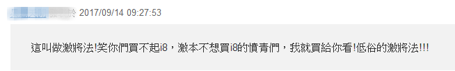 听起来好像有些道理,不过大概没有几个人会中招了。大陆在留言中表示谁说买不起?我月收能买好几台,只是我要当有骨气的中国人!、不是买不起,是不稀罕!我们现在重视教育不炫富,挖鼻挖鼻、根据统计,大老板、主管都用华为Mate9,只有无房、学历低的才用iPhone,甚至有网友以富士康在大陆设厂为例子,撰文表示没有中国人,全世界都买不起iPhone 8。