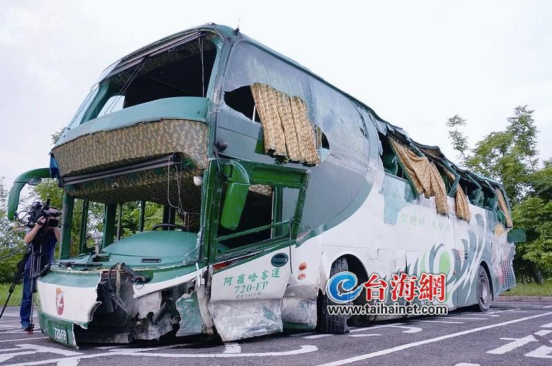 肇事车辆目前暂放于高速口地磅站后方,毁损全貌相当吓人。擦撞中央分隔岛护栏的车体左侧,7面玻璃全碎裂,左侧车轮也爆胎,但右侧几乎没裂,车头则毁损严重,车内走道到处散落碎玻璃、个人物品,不难想象事发时撞击强度。