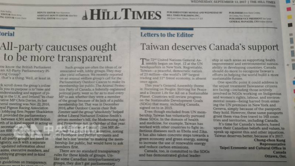 海外网9月14日电第72届联合国大会于当地时间12日在纽约联合国总部开幕,不具参会资格的台当局只能发表酸言酸语来制造事端,甚至不断自我炒作。台驻加拿大代表龚中诚今日(14日)在加拿大媒体《国会山庄时报》(The Hill Times)上投书,声称台湾值得加拿大支持,还拉拢加拿大总理为台湾挺身而出。