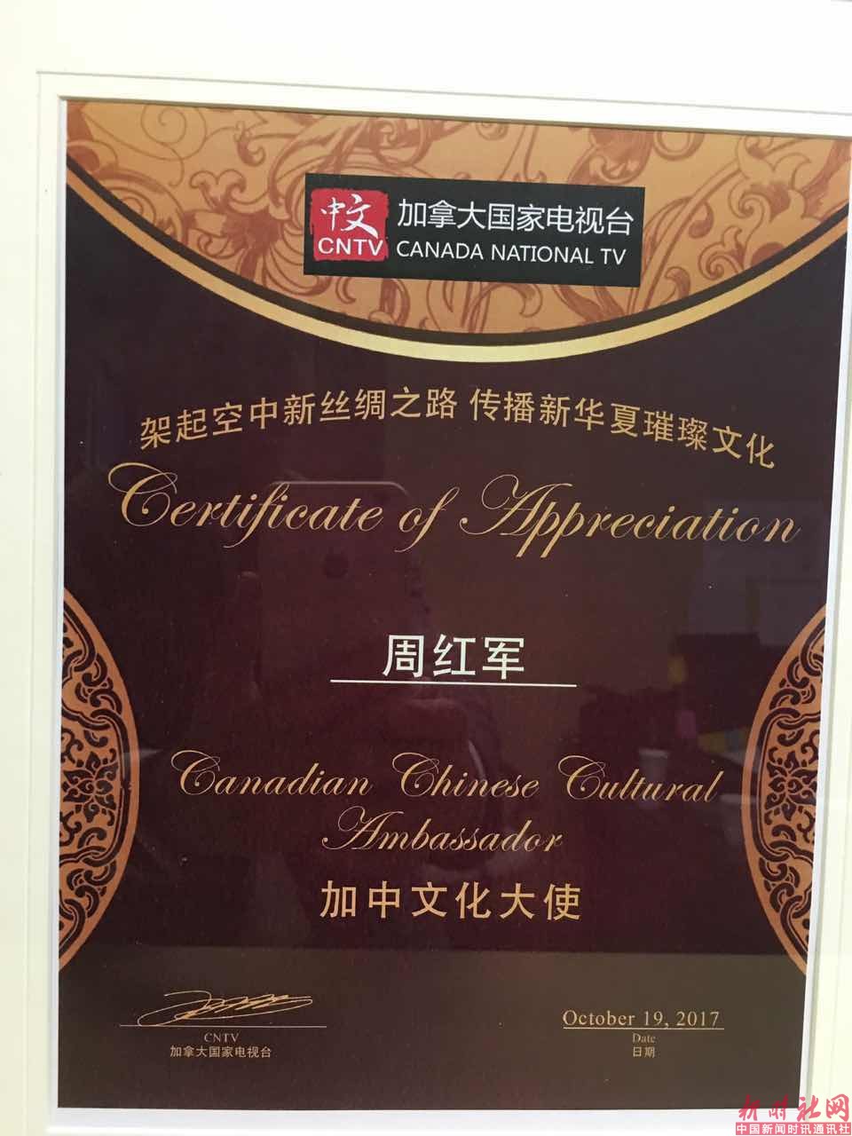 10月21日下午加拿大中加国际文化艺术家联合会会长刘思远女士正式向周红军先生颁发“中加国际文化艺术家联合会荣誉会长”聘书。为了中加文化艺术交流我们将不负众望,砥砺前行为中加友好友谊做出积极的贡献。