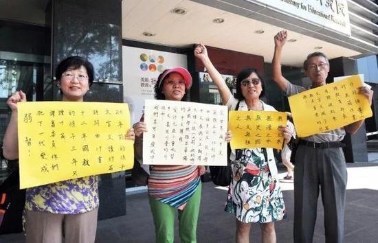 23日上午,挺、反文言文教育立场迥异的民众,到课审大会场外举牌陈情,希望能影响课审会决策。