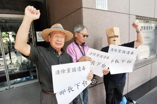 教育转型正义联盟成员郑自才等人,则在会场外另一侧高举清除党国遗毒标语,要求调降文言文比例。
