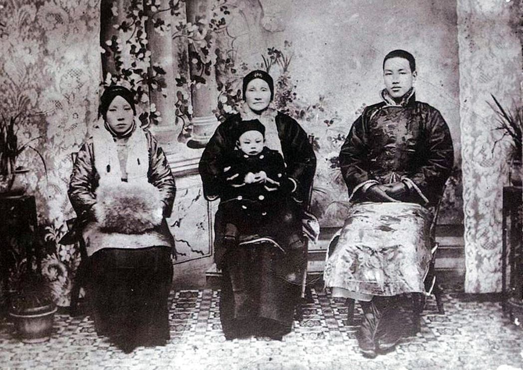 蒋介石的母亲王采玉(中)1910年与蒋介石和元配夫人毛福梅的合影