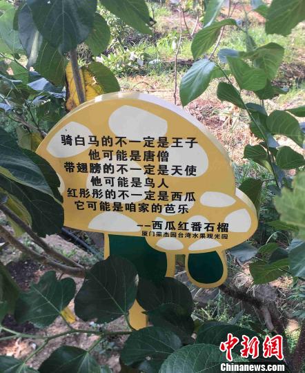 宋志平发挥台湾文创小心思,用段子让游客逛果园时不时会心一笑。 陈悦 摄