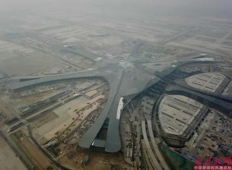 日前,北京新机场航站楼已实现功能性封顶封围,目前正开展二次结构、幕墙、机电安装等分项工程施工。预计到2018年年底,新机场主体工程将基本完工。机场定位为大型国际航空枢纽,规划建设七条跑道,满足年旅客吞吐量1亿人次需求。
