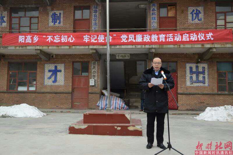 山西站采编部特约记者申亮讯:2018年1月18日上午9时30分许,平顺县阳高乡党委、人民政府、乡纪律检查委员会,在该乡回源头村小学院内举办了“阳高乡“不忘初心 牢记使命”党风廉政教育活动启动仪式、阳高乡弘扬“红船精神”主题党日现场会”等两项活动。活动一开始升国旗、奏国歌,由阳高乡人民政府乡长冯学敏同志引领大家重温入党誓词。这两项活动均由阳高乡纪律检查委员会书记赵彦同志主持,阳高乡党委书记张永杰同志在启动仪式上作了重要讲话,并在“红船精神”主题党日现场会上回顾了中国共产党的光辉历程,并向大家介绍了回源头村在1940年是平北县抗日民主政府的历史沿革等,号召参加这次活动的各行政村的第一书记、村党支部书记、村委会主任、村监委会主任、村报账员以及乡政府全体干部要弘扬“红船精神”,不忘初心 牢记使命,为了打好脱贫攻坚战,为了全乡的经济大发展贡献力量。