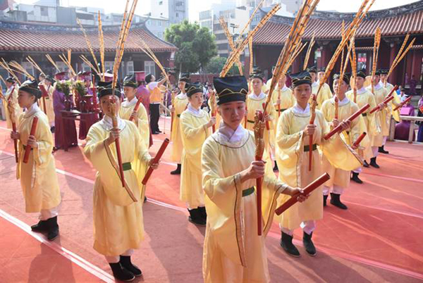 台南孔庙祭礼由代理市长李孟谚担任正献官,仪式依照古礼执行迎神礼、初献礼、分献礼、亚献礼、撤馔礼、送神礼等38道仪式,并由忠义小学学生手执单羽,演出六佾舞,场面庄严隆重。