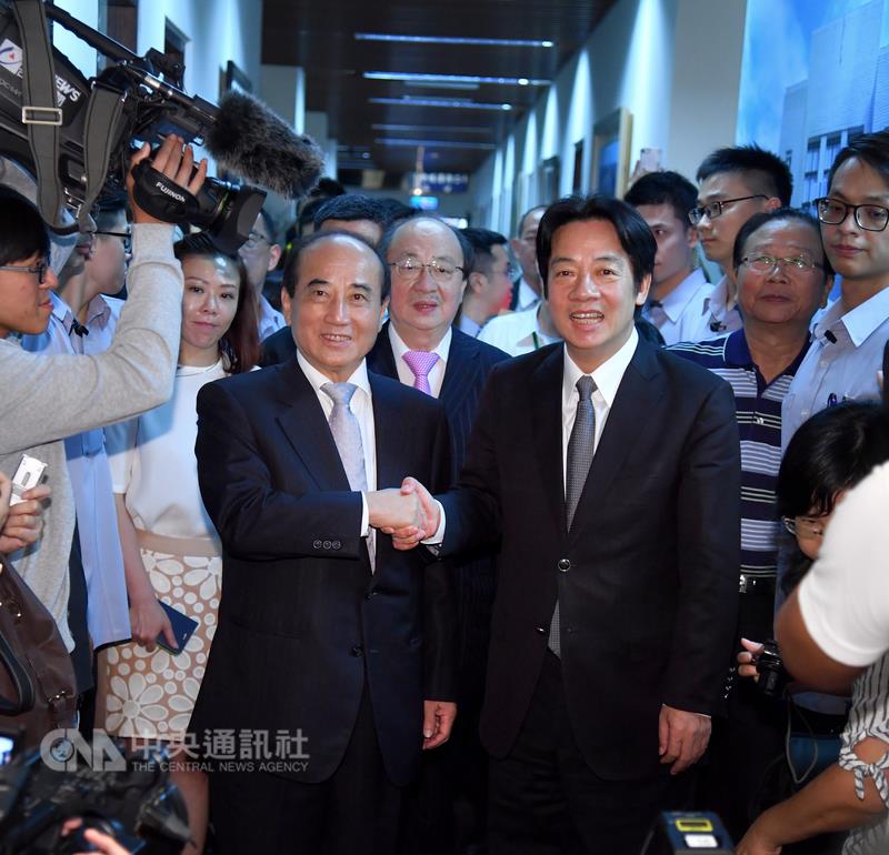 赖清德19日下午率行政院秘书长卓荣泰前往立法院拜会王金平;中国国民党立法院党团总召集人林德福、国民党团首席副书记长李彦秀及民进党党团总召集人柯建铭一同与会。