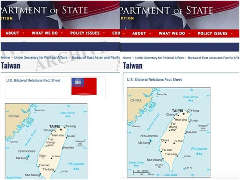 报道并称,特朗普上任后,国务院官网在5月底时仍可看见台湾的地理位置图及台当局的青天白日满地红旗。不过,该旗帜的图案最近却消失不见,只留下台湾地图。国务院东亚暨太平洋事务局发言人格蕾丝与台湾关系法的一中政策。但就未说明为何青天白日满地红旗不见页面上。