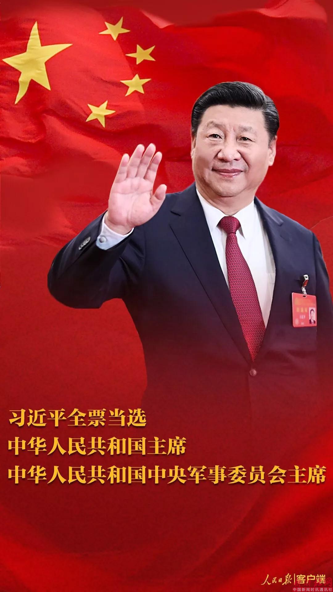 在春风吐绿、草木萌发的美好时节,十三届全国人大一次会议举行全体会议,选举产生新一届国家机构领导人员,中共中央总书记、中央军委主席习近平全票当选中华人民共和国主席、中华人民共和国中央军事委员会主席。这充分体现了党的意志、人民意志、国家意志的高度统一,充分反映了全党全军全国各族人民的共同愿望和心声,必将鼓舞和动员亿万人民更加紧密团结在以习近平同志为核心的党中央周围,同心同德,开拓进取,决胜全面建成小康社会,夺取新时代中国特色社会主义伟大胜利,为实现中华民族伟大复兴的中国梦而不懈奋斗。