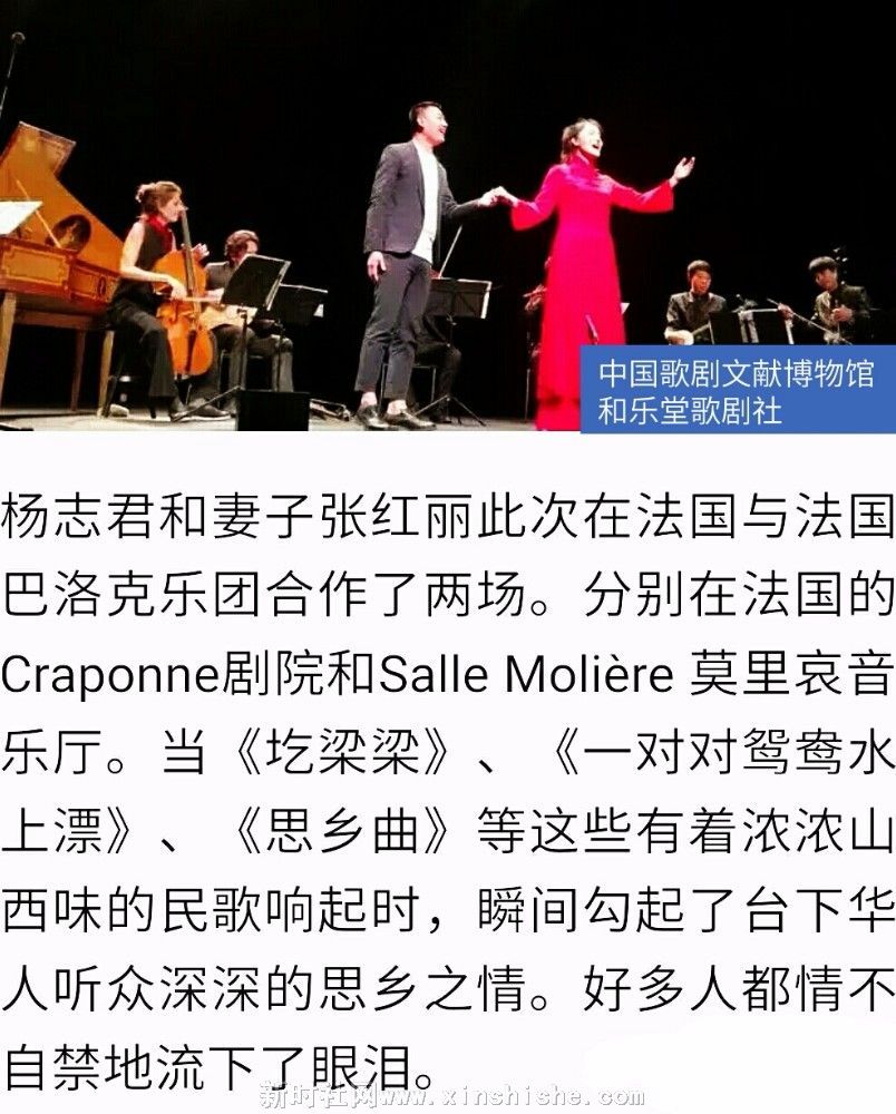 杨志君和妻子张红丽此次在法国与法国巴洛克乐团合作了两场。分别在法国的Craponne剧院和Salle Molière 莫里哀音乐厅。当《圪梁梁》、《一对对鸳鸯水上漂》、《思乡曲》等这些有着浓浓山西味的民歌响起时,瞬间勾起了台下华人听众深深的思乡之情。好多人都情不自禁地流下了眼泪。