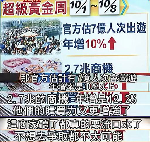 今年,大陆约会有7亿人次会出游且大概会创造出2.7兆(台湾方面所使用的兆为1万亿新台币)的十一超级黄金周,台媒羡慕的表示,如此商机真是令不少台湾观光业的商家都垂涎。