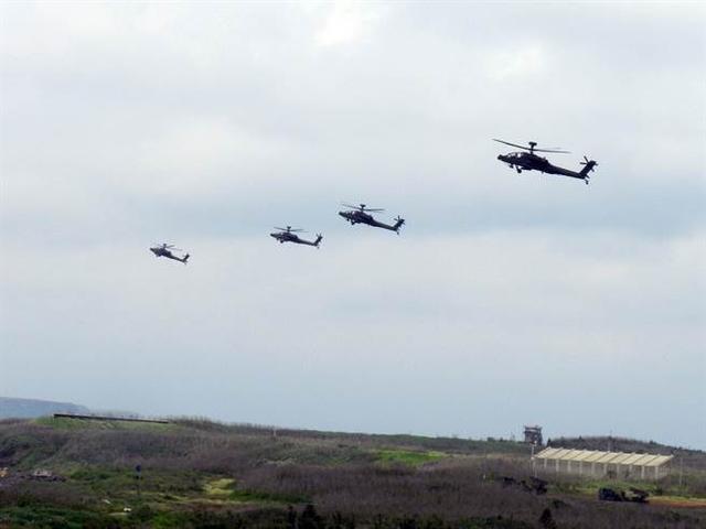 2017年台军汉光演习AH-64E阿帕契战斗直升机空中组队攻击。(台湾中时资料照)