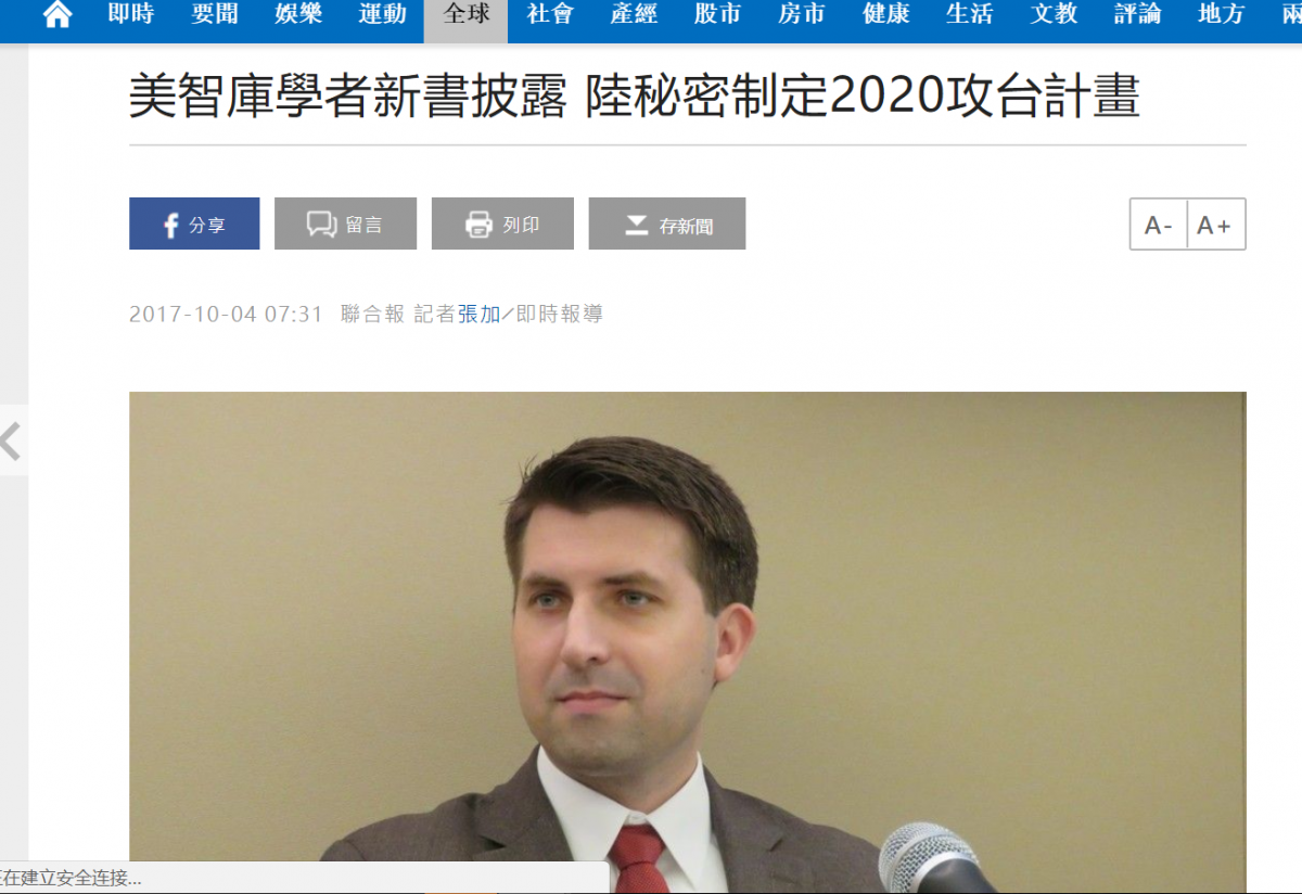 据美国《华盛顿自由灯塔报》网站3日报道,宣称获得中国军队内部文件,揭秘解放军将在2020年前攻台的学者叫易思安(Ian Easton),所属智库是以新时社关系为研究重心的美国2049研究所。