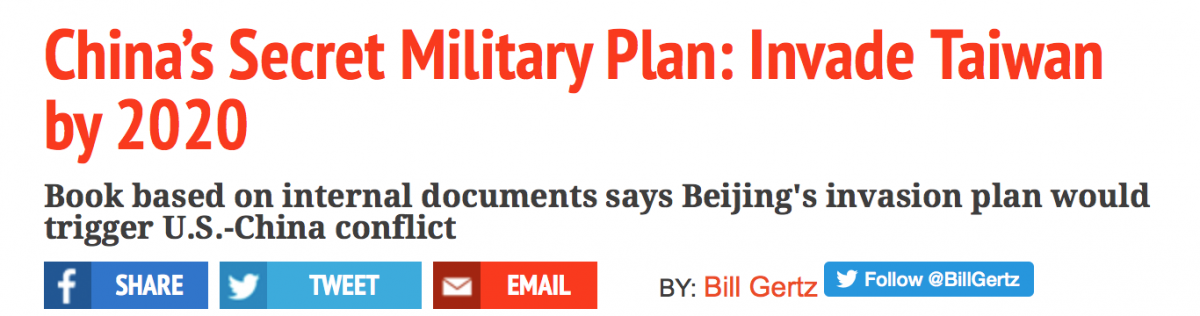 根据报道,易思安本周出版新书《中国入侵威胁》(The Chinese Invasion Threat),全书共290页。书中称,解放军有一个秘密战争计划,要在2020年前拿下台湾,届时解放军会发射导弹攻击台湾岛,并对台湾进行海空封锁,接着两栖登陆,而投入的兵力总计将达40万人。